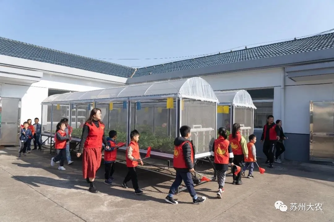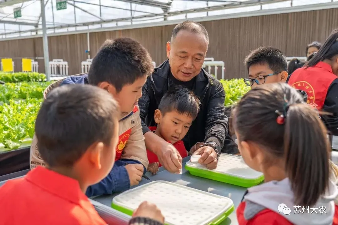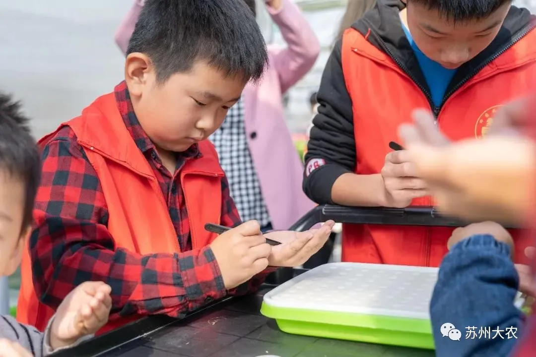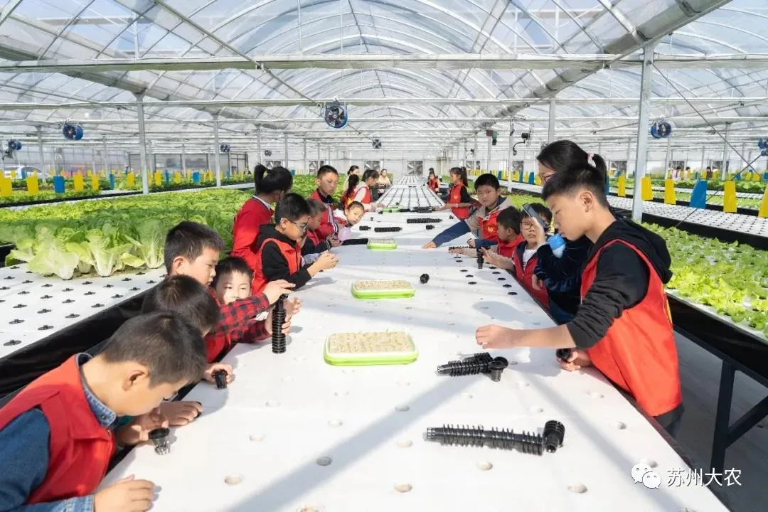 小朋友們套上鞋套,洗干凈手,進入水培蔬菜種植大棚,一眼望去,蔥蔥蘢蘢得蔬菜長得漂亮極了,孩子們在大農員工給他們提供的育苗、移栽平臺上,用小小的鑷子將蔬菜種子放入育種盤,小心翼翼地將生長的小苗種上床。