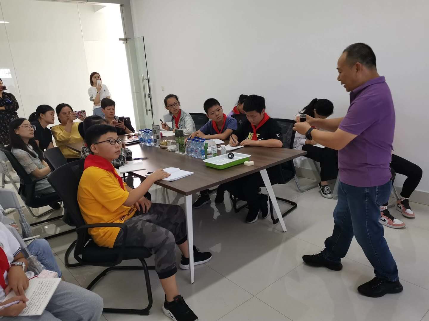 在農學體驗活動中,為了讓同學們把此次農學體驗活動進行得更有深度及廣度,大農農業的周總首先在實驗基地給同學們上了一堂理論課,從水是生命之源、土壤的組成、耕作的環境、條件、植物光合作用和呼吸作用、植物所需的營養元素到水耕的概念、要素、特點、優勢等一一作了介紹。